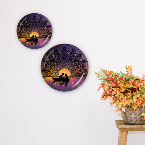 Silsila-e-Shaam Ceramic Decorative Wall Plate portrays a couple sharing a tender moment against a radiant dusk sky.