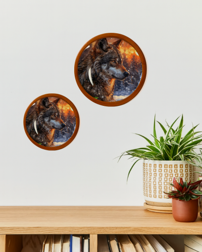 A captivating wooden decorative plate showcasing a majestic wolf illuminated by warm golden forest light. The rich textures and dramatic contrast create a powerful visual that represents courage, loyalty, and the spirit of the wild.