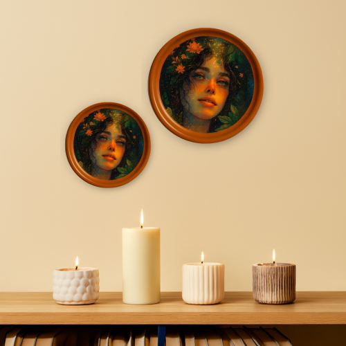 Cosmic Bloom Wooden Decorative Wall Plate blends celestial hues with delicate botanicals to create an ethereal feminine aura.