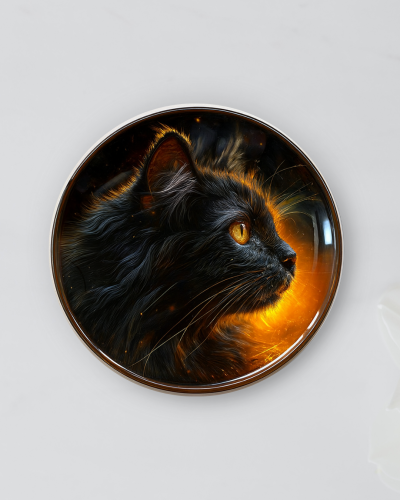 A captivating ceramic decorative plate showcasing a sleek black cat illuminated by a radiant amber glow. The intense eyes and soft lighting create a magical, nocturnal mood that celebrates curiosity, elegance, and quiet strength.